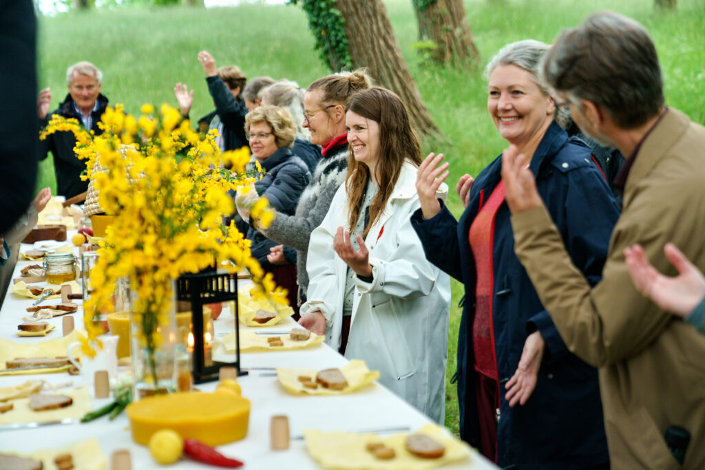 “Iført pludderbukser blev vi selv en slags arbejdsbier, der efter at blive tunet ind med en summende halmbikube over hovedet fik udstukket forskellige bijobs og lærte noget om sværmintelligens. Sjovt at blive sendt ud som spejderbier med kæmpe lup som insektøje på jagt efter blomster at suge nektar fra. Ligesom bierne danser for at signalere til flokken, hvor der er fristende blomster, skulle vi danse en svansedans som signal til den store banketfinale omkring et langt bord.”
